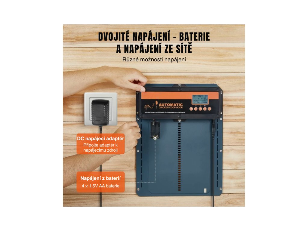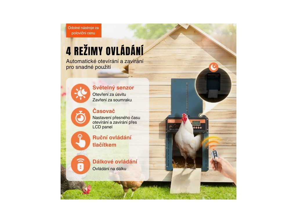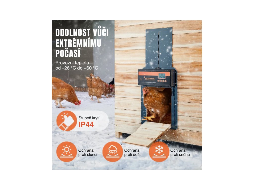 Automatická dvířka pro slepice, 21 × 26 cm, IP44, světelný senzor + časovač, LCD, hliníková slitina