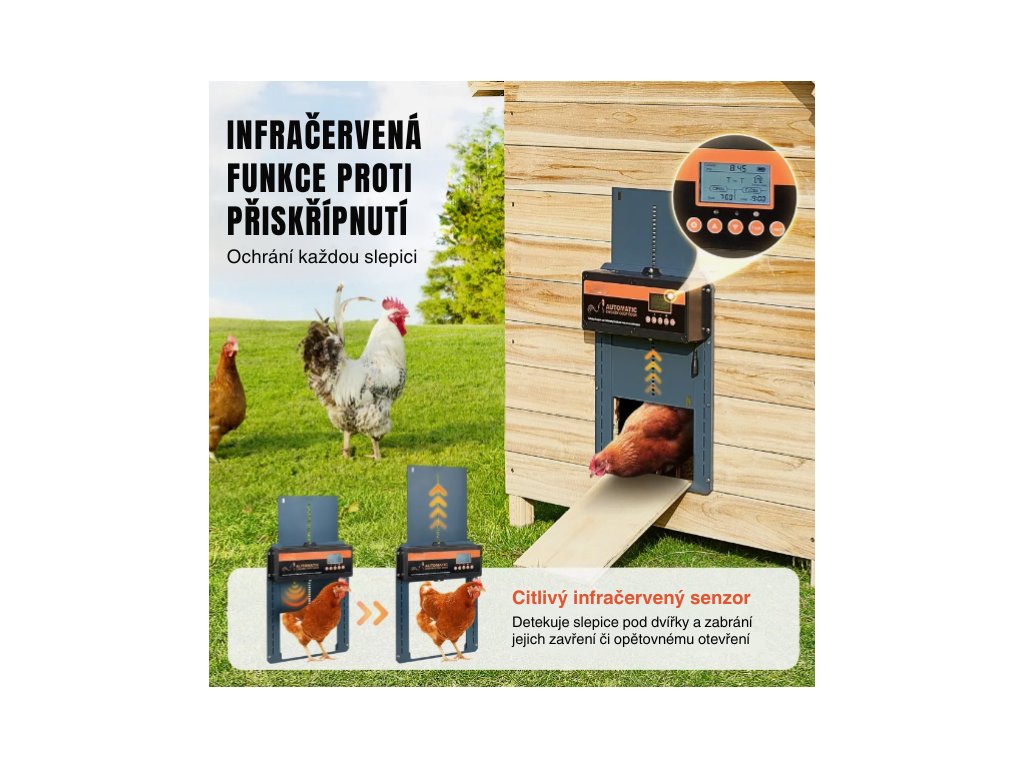 Dvířka jsou vybavena infračerveným senzorem proti přiskřípnutí, který chrání slepice před úrazem. Pokud senzor zaznamená překážku, zavírání se okamžitě zastaví. LCD displej zobrazuje aktuální stav otevření i zbývající kapacitu baterie.