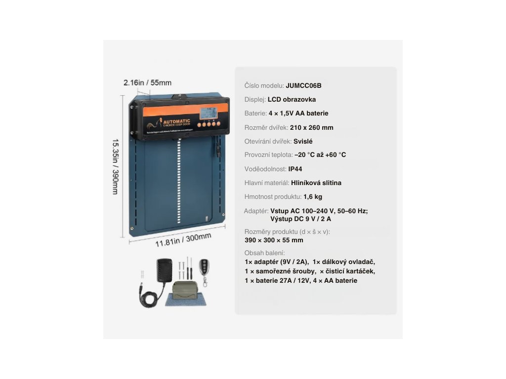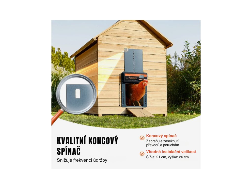 Automatická dvířka pro slepice o rozměrech 21 × 26 cm jsou navržena pro pohodlné a bezpečné otevírání a zavírání kurníku. Díky časovači, světelnému senzoru, LCD displeji a dálkovému ovladači nabízejí snadné ovládání a vysokou spolehlivost v každodenním provozu.