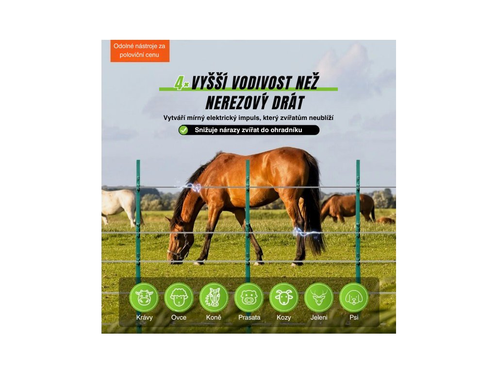 Drát z hliníkové slitiny nabízí až čtyřikrát vyšší vodivost než nerezová ocel. Zajišťuje spolehlivé vedení elektrického impulsu, který zvířatům poskytuje bezpečné, ale účinné varování při kontaktu s ohradníkem.