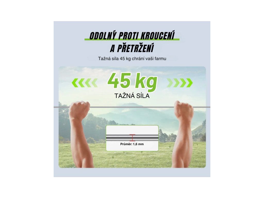 Průměr 1,6 mm a tahová síla až 45 kg zajišťují vysokou pevnost v tahu a stabilitu. Díky tomu je drát vhodný i pro dočasné ohrady a střídavou pastvu.