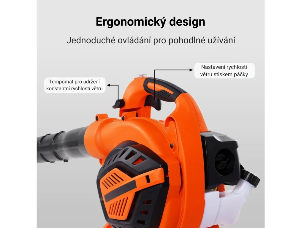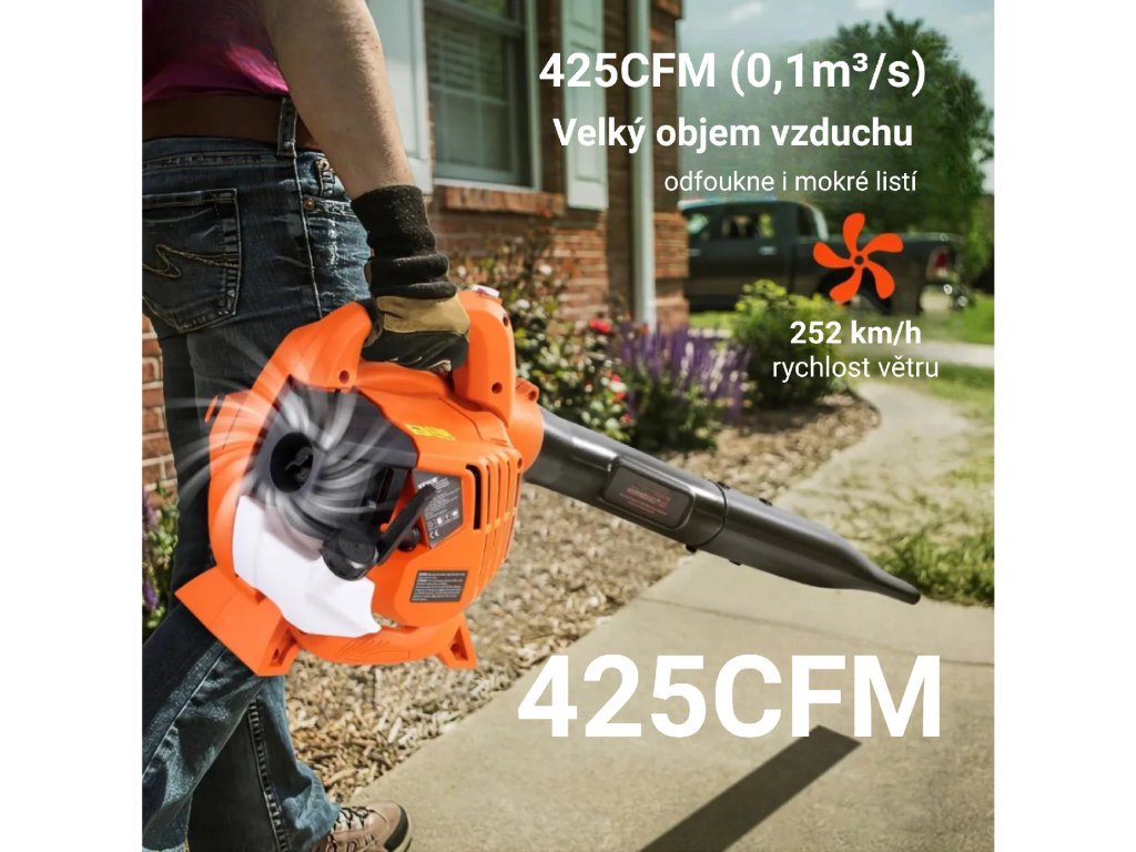 Ruční benzínový foukač listí s dvoutaktním motorem 26 cm³ dosahuje výkonu 425 CFM a rychlosti vzduchu až 252 km/h. Nabízí funkci foukání i vysávání se sběrným vakem a má tempomat pro pohodlné ovládání. Součástí balení je kompletní sada příslušenství včetně nářadí a ochranných sluchátek.