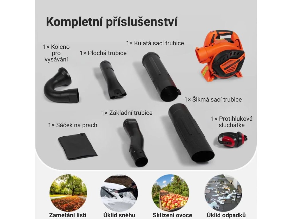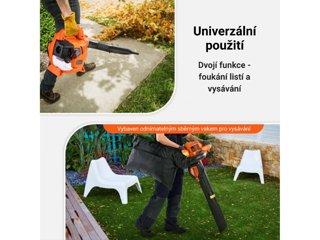 Součástí stroje je sběrný vak a sací trubice, díky nimž lze foukač snadno přeměnit na vysavač listí. Tato funkce umožňuje nejen listí a nečistoty odfouknout, ale také je sesbírat a zjednodušit tak úklid.