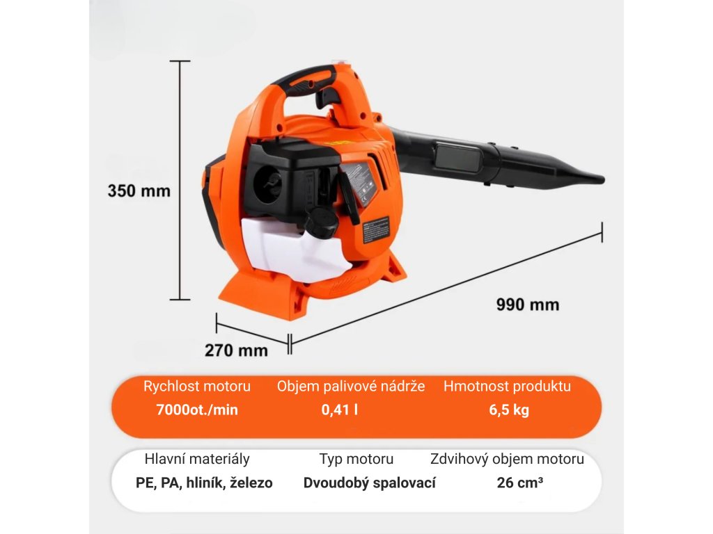 Ruční foukač listí je vybaven benzínovým dvoutaktním motorem o objemu 26 cm³ s maximálními otáčkami 7000 ot./min. Konstrukce motoru umožňuje úsporu paliva až o 20 % oproti běžným modelům. Zařízení dosahuje průtoku vzduchu 425 CFM a rychlosti proudění až 252 km/h, což umožňuje účinné odstranění mokrého listí, písku, štěrku i sněhu.
