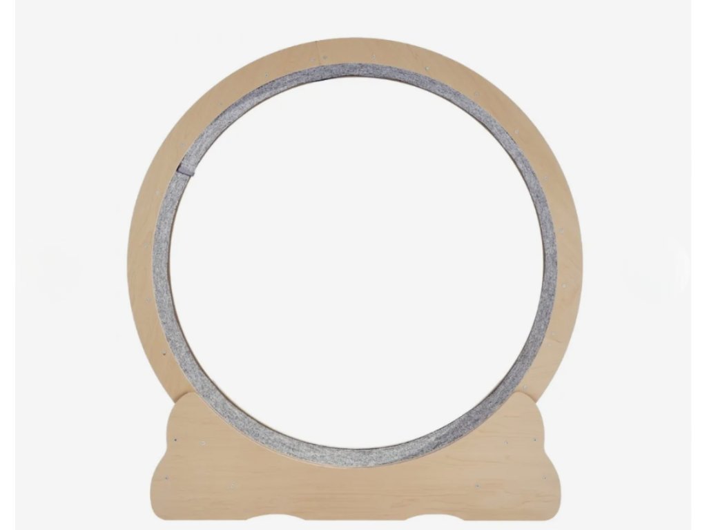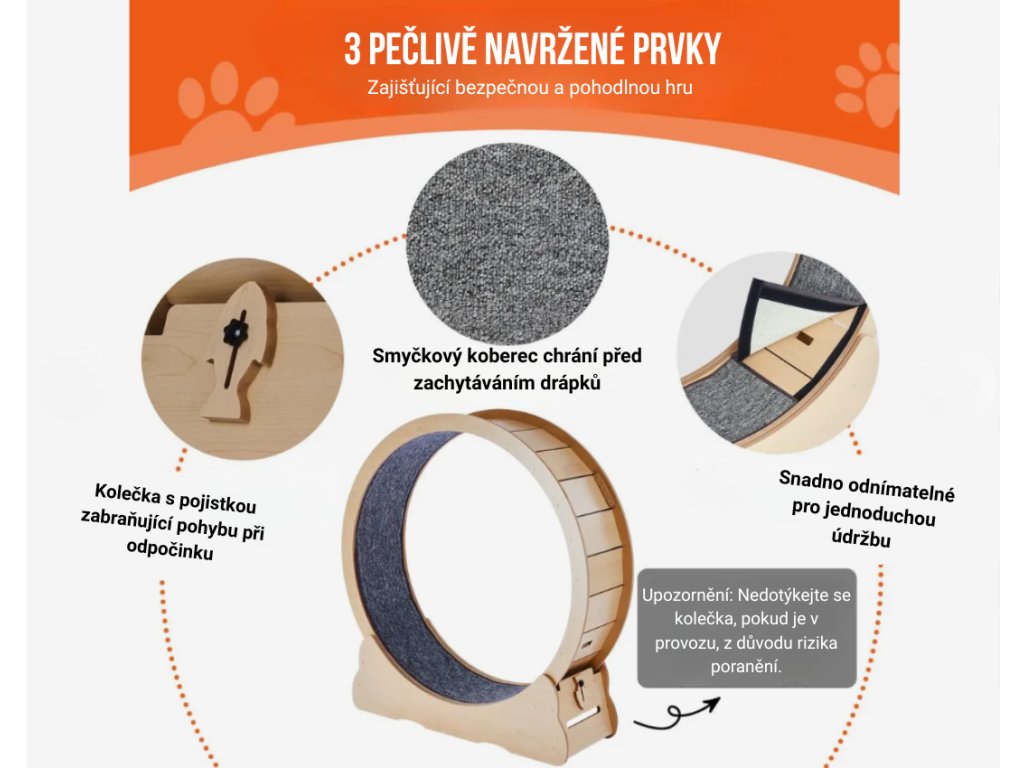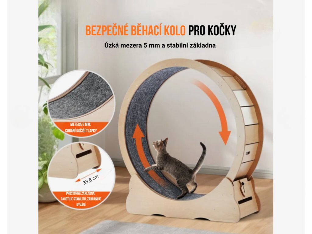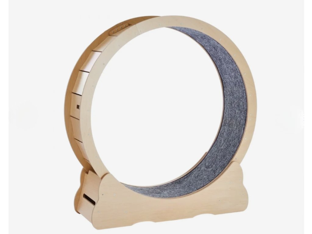 Kočičí běhací kolo o průměru 110 cm je navrženo s důrazem na dlouhou životnost a bezpečný provoz. Konstrukce je vyrobena z pevné dřevěné desky o tloušťce 1,2 cm, která zajišťuje vysokou stabilitu i při intenzivním pohybu. Úzká mezera pouhých 0,5 cm minimalizuje riziko poranění tlapek. Rozšířená základna a stabilní běžecká dráha přispívají k jistému chodu kola a bezpečnému tréninku kočky v domácím prostředí.