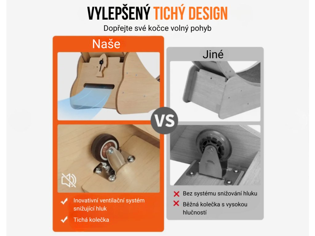Běhací kolo je vybaveno integrovaným tichým ložiskovým systémem a konstrukcí s dvojitou redukcí hluku, díky čemuž je provoz výrazně tišší než u běžných modelů. Kočka může běhat kdykoliv během dne i noci bez rušení okolí. Tichý chod zároveň zvyšuje komfort zvířete a podporuje pravidelné používání.
