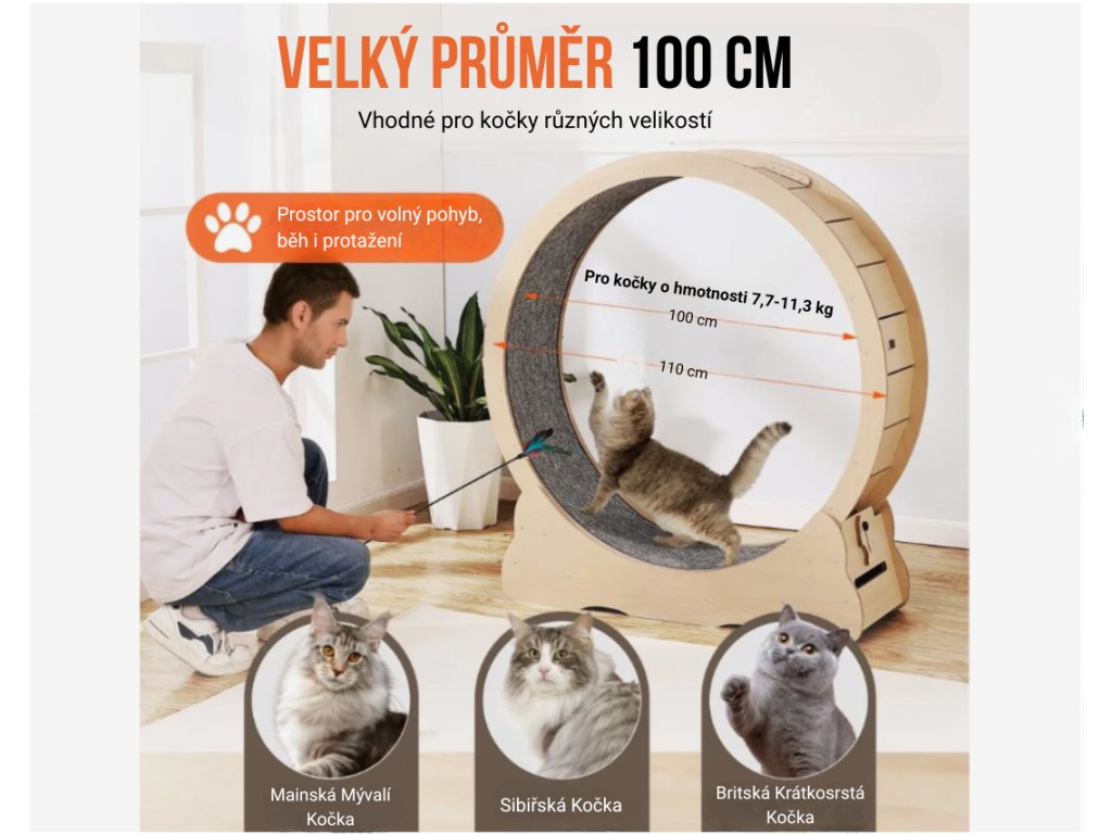 Díky vnějšímu průměru 110 cm a vnitřnímu průměru 100 cm poskytuje kolo dostatek prostoru pro přirozený pohyb i plné natažení těla. Je vhodné pro většinu koček až do hmotnosti 11,3 kg. Pravidelný pohyb na běhacím kole pomáhá snižovat riziko nadváhy, podporuje zdraví kloubů a přispívá k celkové fyzické kondici kočky.
