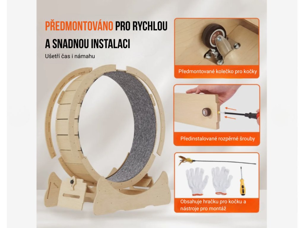 Instalace je rychlá a jednoduchá díky předinstalovaným rozpěrným šroubům a kolečkům. Součástí balení je také příslušenství včetně rukavic, šroubováku a kočičí hračky. Odnímatelná, odolná běžecká podložka je nenáročná na údržbu a snadno se čistí vlhkým hadříkem nebo houbičkou. Kolo lze uzamknout do statického režimu, takže poslouží nejen pro běh, ale také jako místo k odpočinku, hraní nebo šplhání. Díky tomu zapadne do interiéru i jako funkční kočičí nábytek.