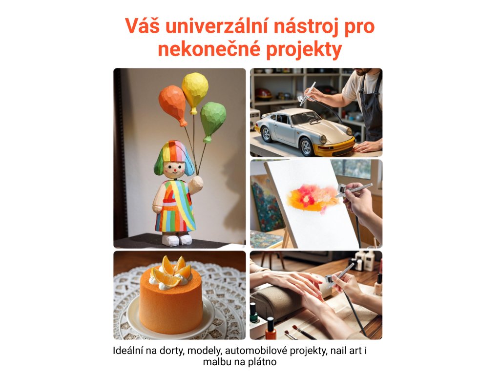 Airbrush sada je vhodná pro modelářství, malbu na plátno, autodetailing, nail art, dekorace dortů i další kreativní techniky. Díky variabilitě trysek se přizpůsobí jak detailní práci, tak plošnému nanášení barvy. Uplatnění najde v domácích dílnách, ateliérech i při hobby tvorbě.