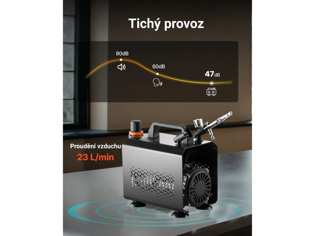 Kompresor pracuje s nízkou hlučností, což umožňuje soustředěnou práci bez rušení okolí. Tichý chod je vhodný pro použití v domácím prostředí, ateliéru i menší dílně, a to i při delším provozu.