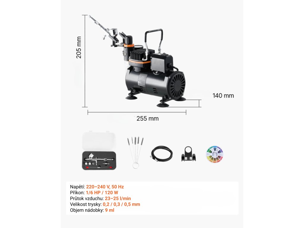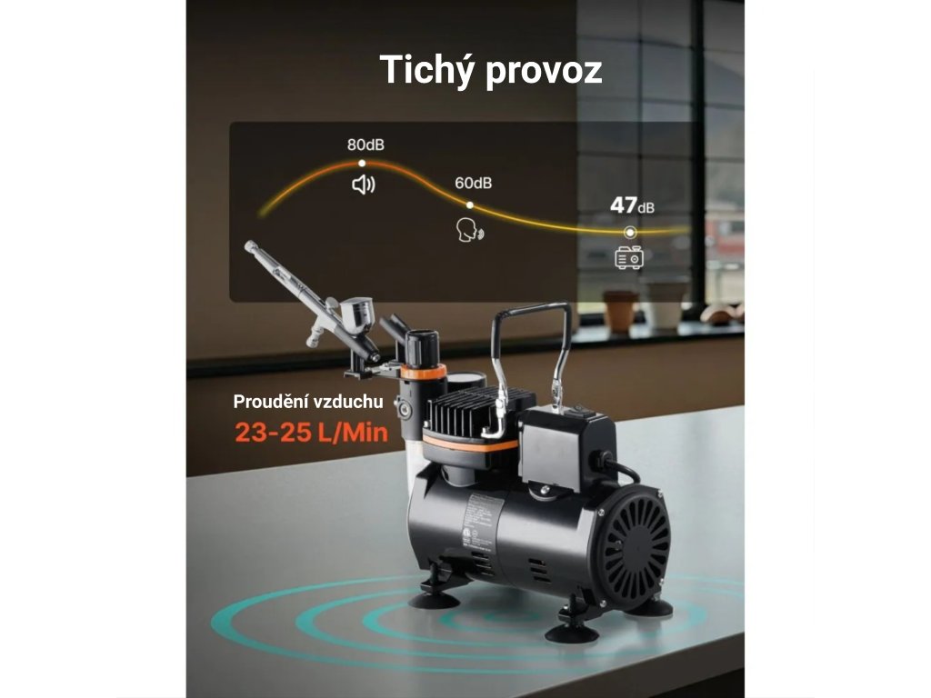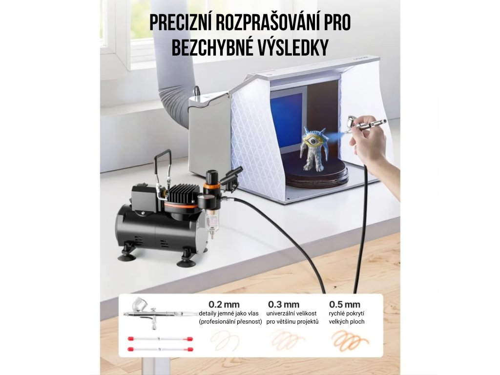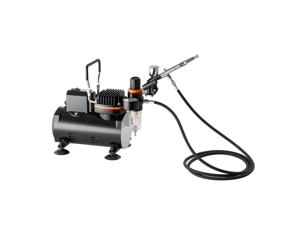 Kompletní airbrush sada s tichým kompresorem, Dual Action pistolí a tryskami 0,2 / 0,3 / 0,5 mm. Vhodná pro modelářství, dekorování, malbu i detailní práci. Nabízí přesné rozprašování, snadné ovládání a jednoduchou údržbu.