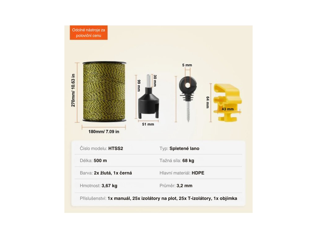 Lanko na elektrický ohradník o délce 500 m a průměru 3,2 mm je vyrobeno z HDPE a 6 nerezových vláken. Odolává UV záření, korozi a vydrží tažnou sílu 68 kg. Dodává se s 50 izolátory a cívkou pro snadnou instalaci.