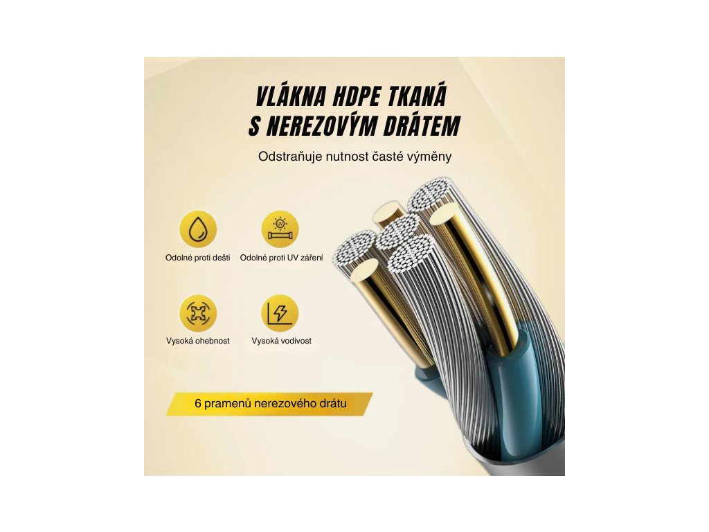 Lanko je vyrobeno z kombinace HDPE vláken a nerezových vodičů, což mu zajišťuje vysokou pevnost a dlouhou životnost. Odolává korozi i UV záření a zůstává spolehlivé i při dlouhodobém venkovním použití.
