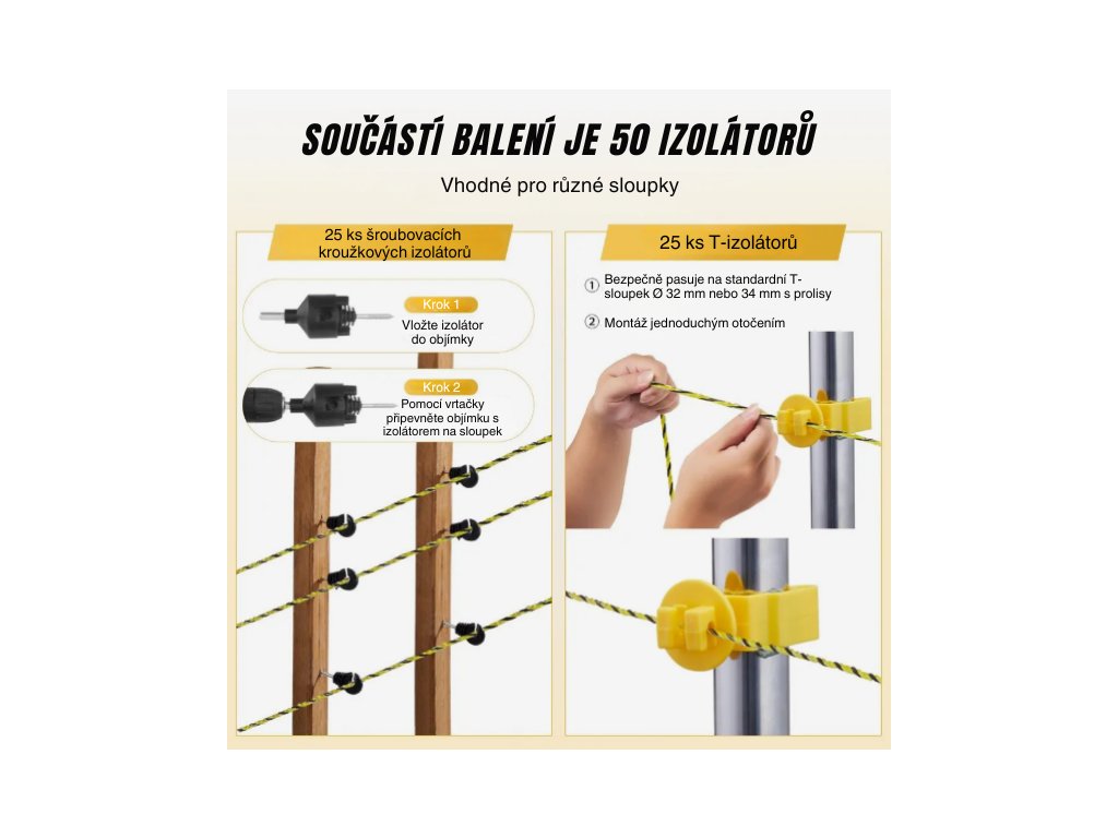 Příšlušenství: | 25x izolátory na plot, 25x T-izolátory, 1x objímka |