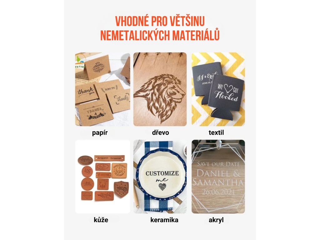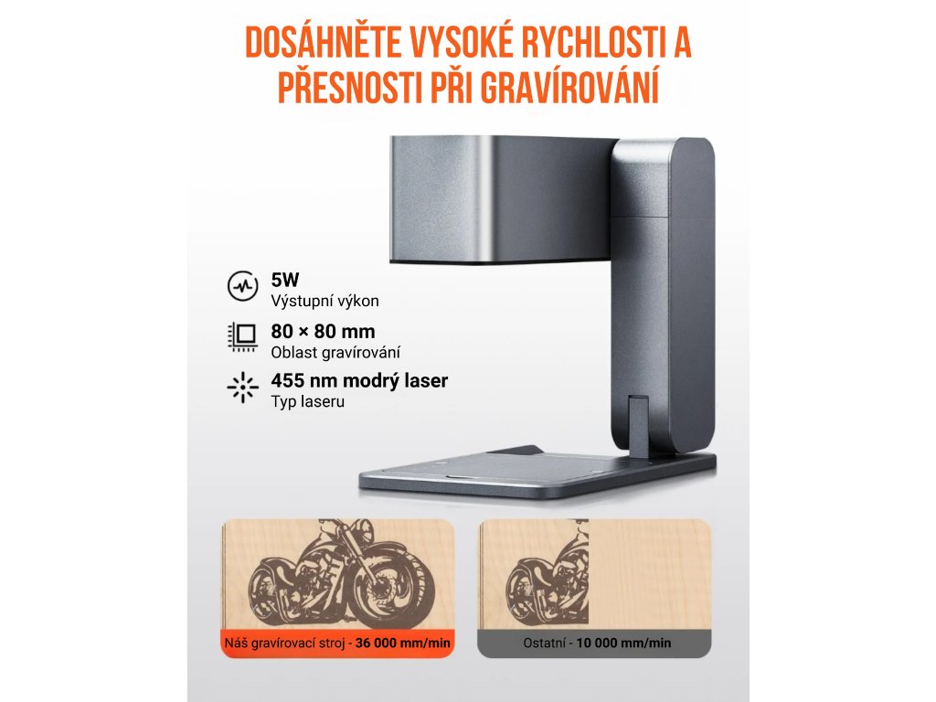 Zařízení nabízí automatické zaostření na jedno stisknutí, což umožňuje rychlé a přesné gravírování. Gravírovat lze na širokou škálu materiálů, včetně papíru, dřeva, textilu, kůže, keramiky a akrylu. S dlouhou životností laseru až 10 000 hodin je stroj vhodný jak pro malé, detailní projekty, tak pro rozsáhlé gravírovací úlohy.