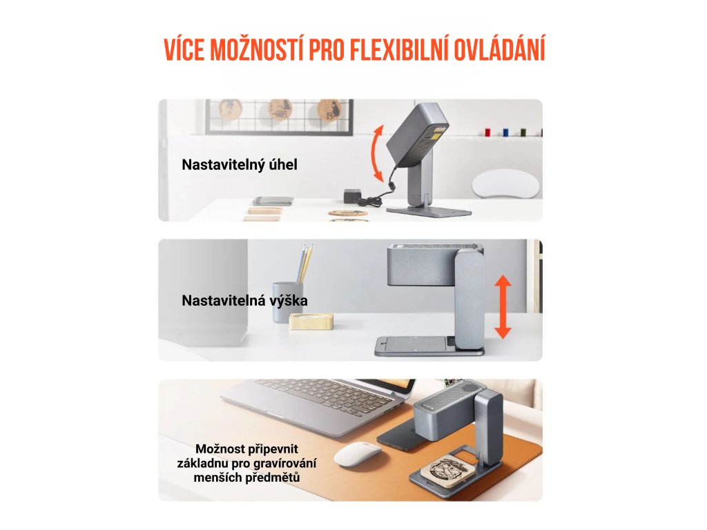 Laserový gravírovací stroj umožňuje nastavení úhlu a výšky, aby vyhovoval různým pracovním požadavkům. Základna je odnímatelná, což usnadňuje gravírování menších předmětů nebo větších objektů. Díky více možnostem ovládání a flexibilní konstrukci je stroj vhodný pro různé typy gravírovacích prací a různé materiály.