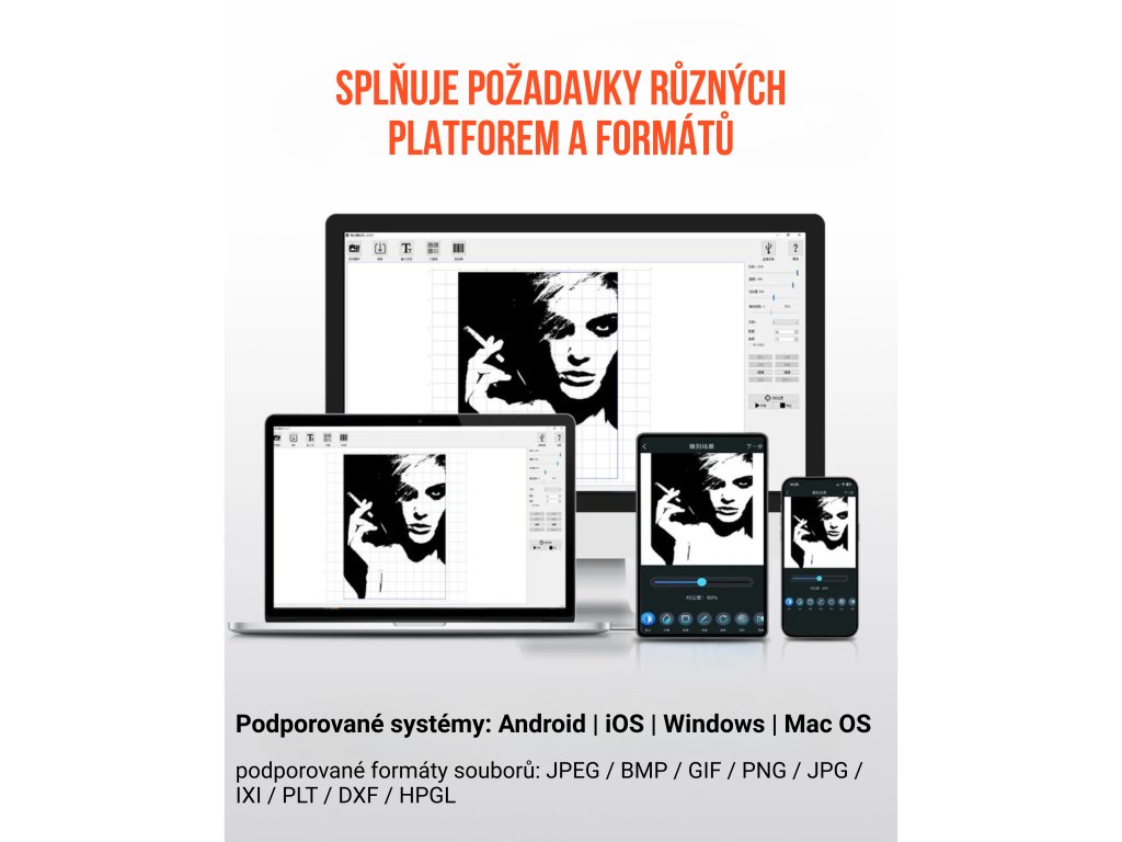 Zařízení podporuje systémy Android, iOS, Windows a Mac OS a dokáže pracovat s více formáty souborů: JPEG, BMP, GIF, PNG, JPG, PLT, DXF, HPGL. Tato kompatibilita zajišťuje jednoduchou integraci do různých pracovních procesů a umožňuje pohodlnou práci s oblíbenými softwarovými nástroji.