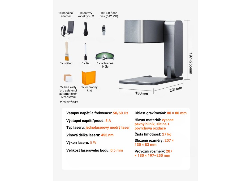 Laserový gravírovací stroj s pracovní plochou 80 × 80 mm a modrým laserem 5 W umožňuje rychlé a přesné gravírování na různé nemetalické materiály, včetně dřeva, papíru, textilu či kůže. Díky automatickému zaostření, nastavitelnému úhlu a výšce a kompatibilitě s Android, iOS, Windows a Mac OS je vhodný pro detailní i větší projekty. Kompaktní a skládací konstrukce zajišťuje pohodlné přenášení a skladování.