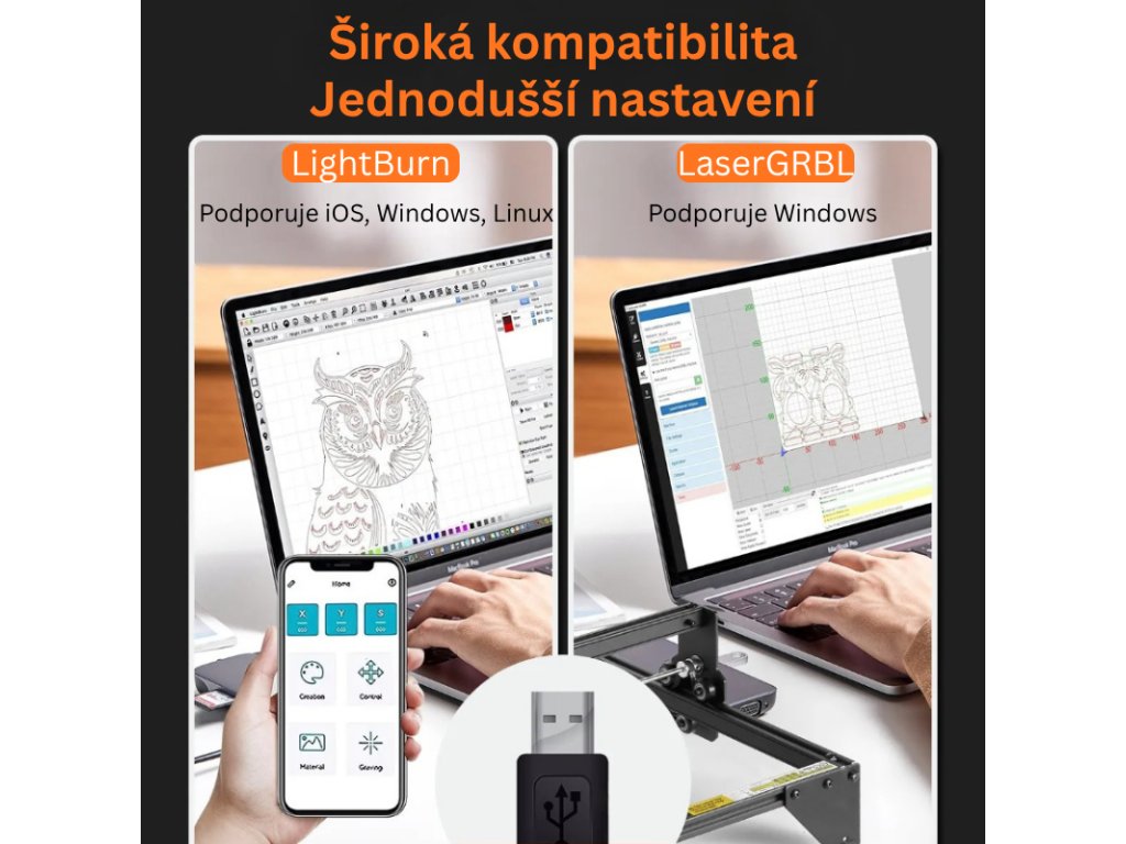 Naše laserová gravírka na dřevo nabízí vynikající softwarovou kompatibilitu a připojuje se k počítači pomocí USB. Je kompatibilní s běžným softwarem pro laserové gravírování, jako jsou LightBurn a LaserGRBL (podporuje systémy iOS, Windows a Linux). Gravírujte širokou škálu materiálů, včetně dřeva, vybraných kovů, neprůhledného akrylu, černě lakovaného skla a dalších.