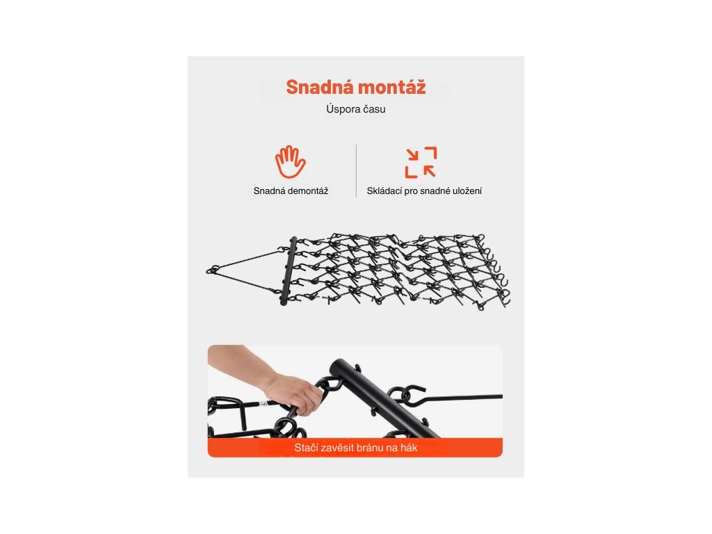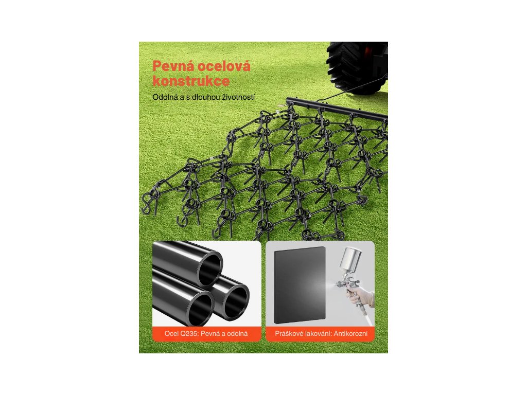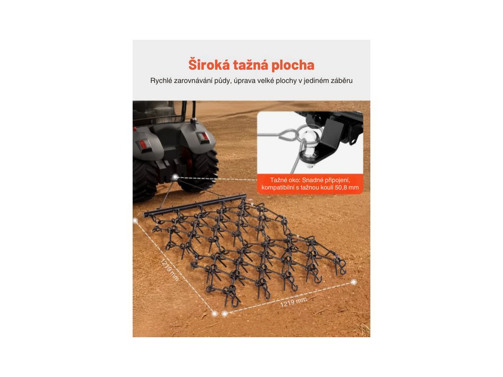 Pracovní šířka 225 cm umožňuje upravit větší plochu v jediném záběru, což zvyšuje produktivitu a snižuje nároky na čas i fyzickou námahu. Bránu lze snadno připojit k běžnému zahradnímu traktoru nebo čtyřkolce díky tažné kouli o průměru 50,8 mm.