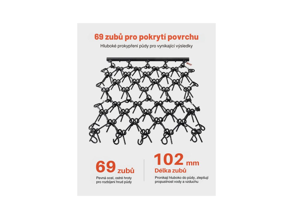 Zuby o délce 150 mm snadno rozruší zhutněný povrch a hrudky, čímž připraví půdu pro setí nebo další úpravy. Hmotnost 25 kg zajišťuje dobrý přítlak na povrch a efektivní práci bez nutnosti další zátěže.