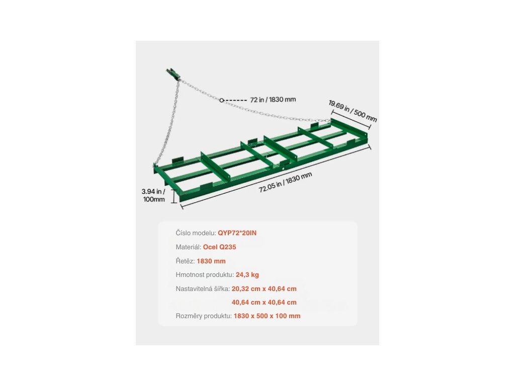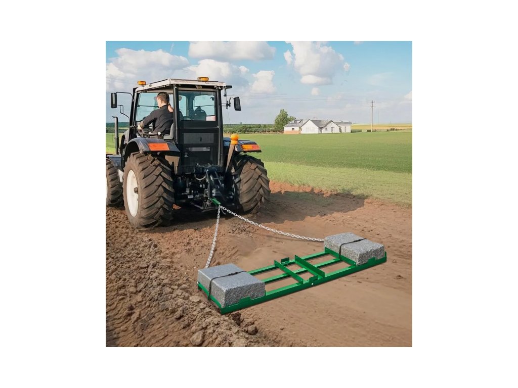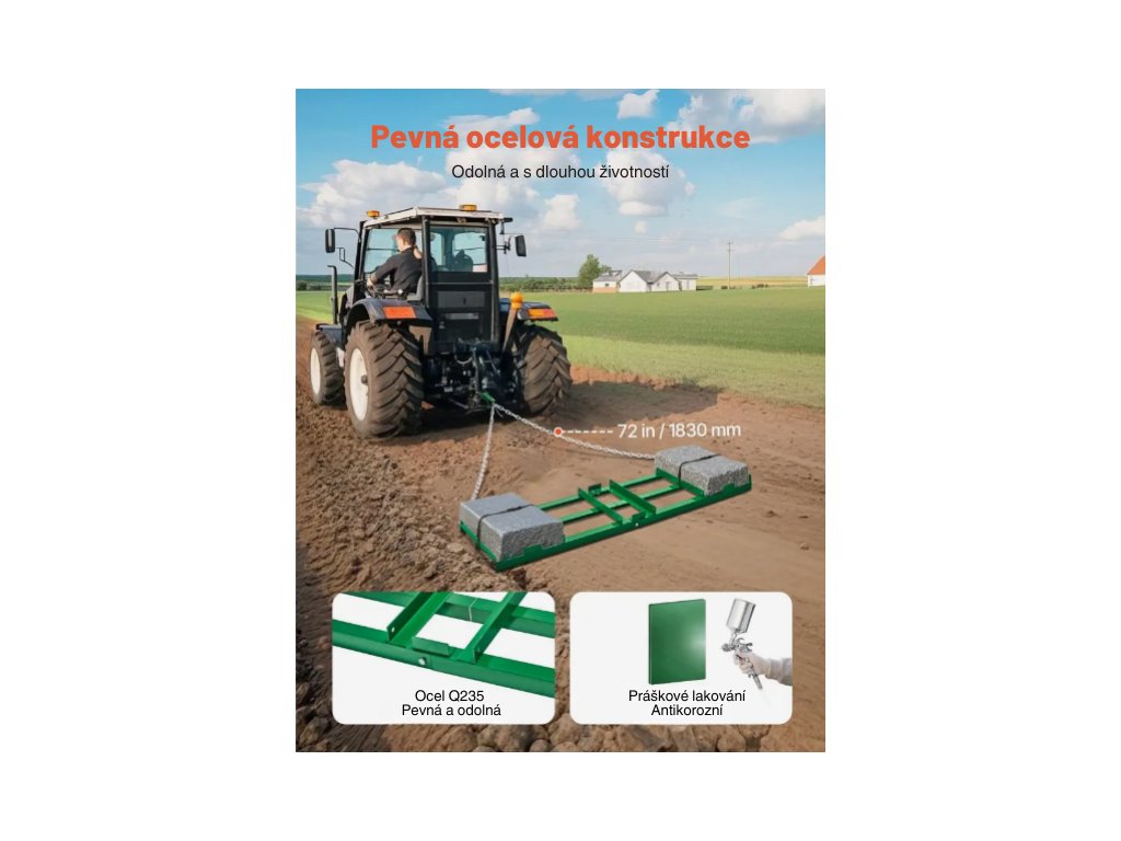 Luční brána za traktor s pracovním záběrem 183 cm a rámem z práškově lakované oceli je určena pro efektivní zarovnávání půdy, štěrku a trávy pomocí jednoduchého tažení za různými typy vozidel.