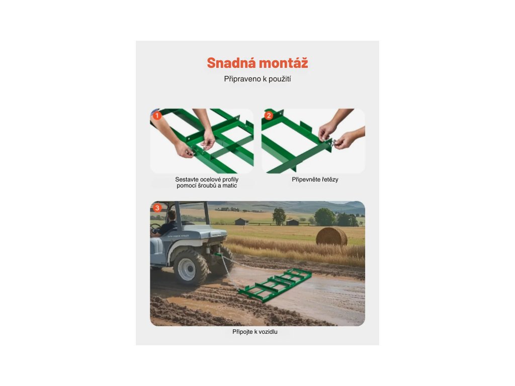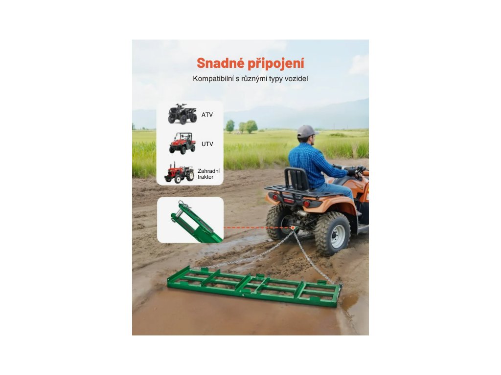 Díky systému tažení pomocí řetězu je bránu možné rychle připojit k různým vozidlům – od zahradních traktorů po čtyřkolky a UTV. Nastavitelná tažná síla pomáhá předejít přetížení nebo poškození tažného bodu.