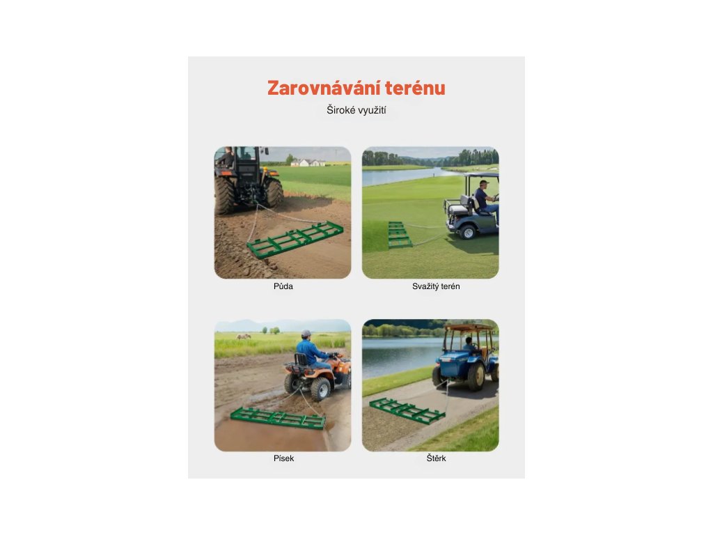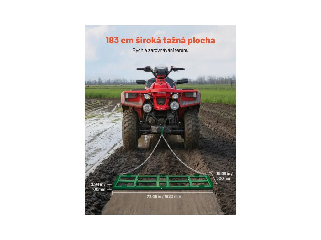 Praktická luční brána za traktor určená k rovnání půdy, štěrku a travnatých ploch s pracovním záběrem 183 cm.