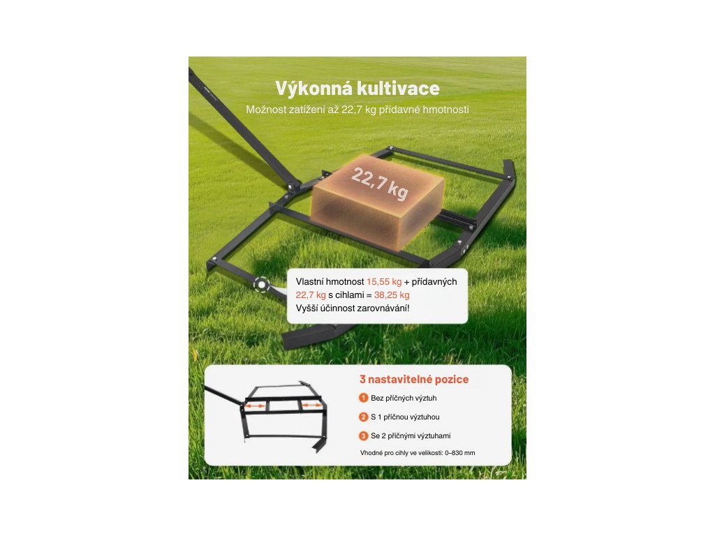 Zařízení umožňuje přidání závaží (např. cihel) až do hmotnosti 22,7 kg pro zvýšení přítlaku na zeminu. Díky nastavitelné výšce prostoru pro zátěž 0-83 cm si poradí i s tvrdou a hrudkovitou půdou. S vlastním hmotností 15,8 kg efektivně zarovnává povrch a je vhodné pro velké plochy.