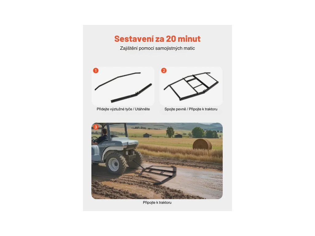 Díky standardizované tažné tyči a kompatibilní šířce závěsného oka je možné zařízení snadno připojit ke čtyřkolkám, zahradním nebo multifunkčním traktorům bez potřeby dalších úprav.