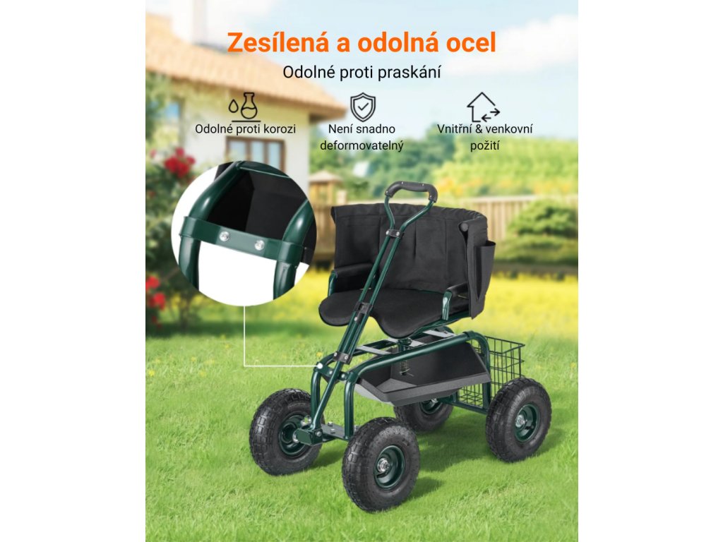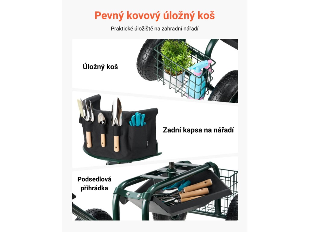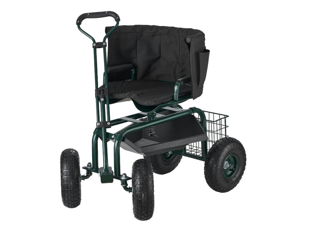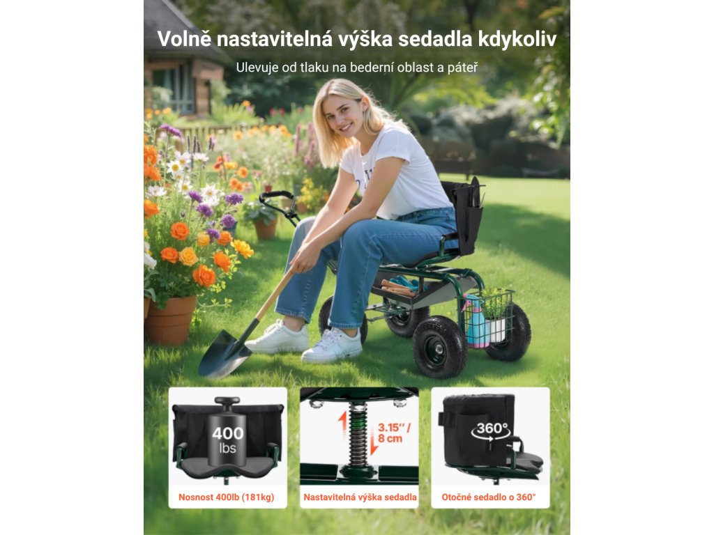 Pojízdný zahradní sedák s 25,4 cm nafukovacími terénními pneumatikami, nastavitelnou rukojetí (58–83,5 cm) a 360° otočným polstrovaným sedadlem pro pohodlnou práci. Odolná konstrukce s nosností až 180 kg doplněná o odnímatelný box na nářadí a drátěný koš udrží vše potřebné po ruce. Vhodný pro zahradu, dílnu i venkovní pracovní plochy.