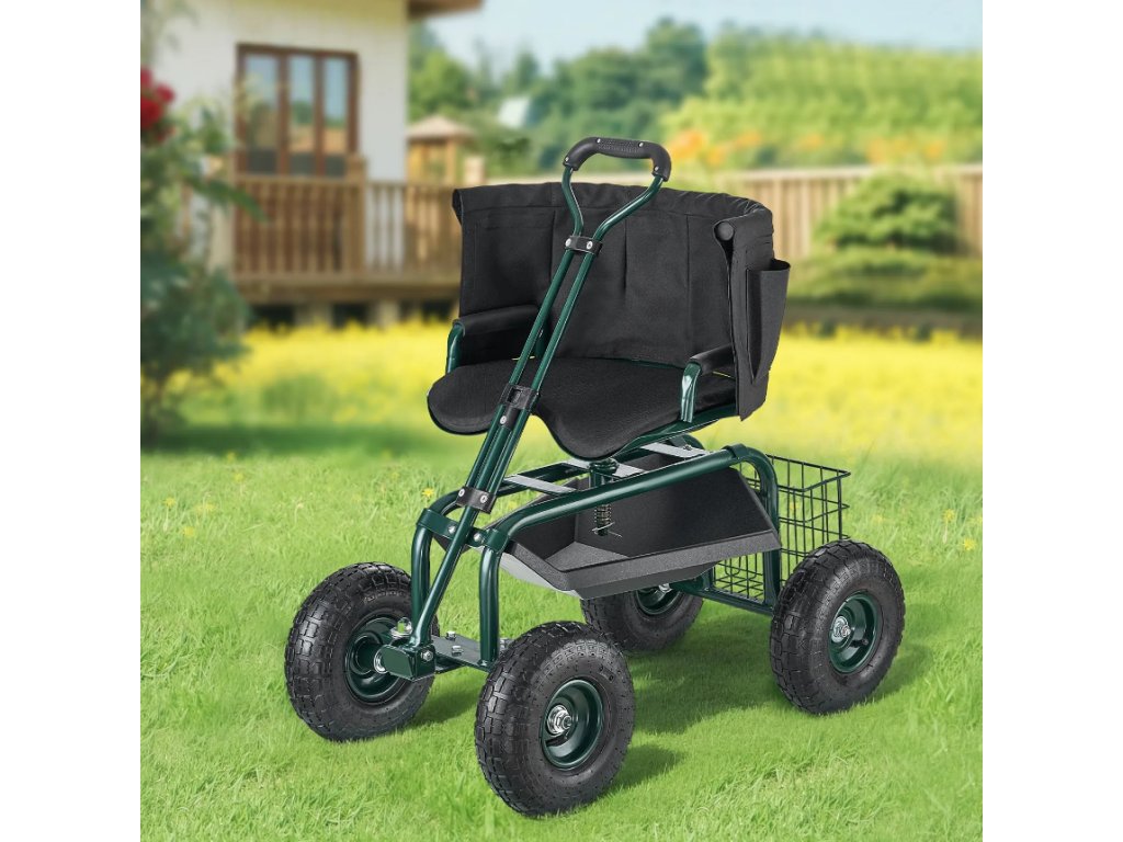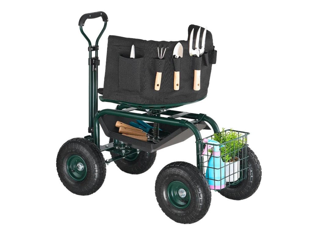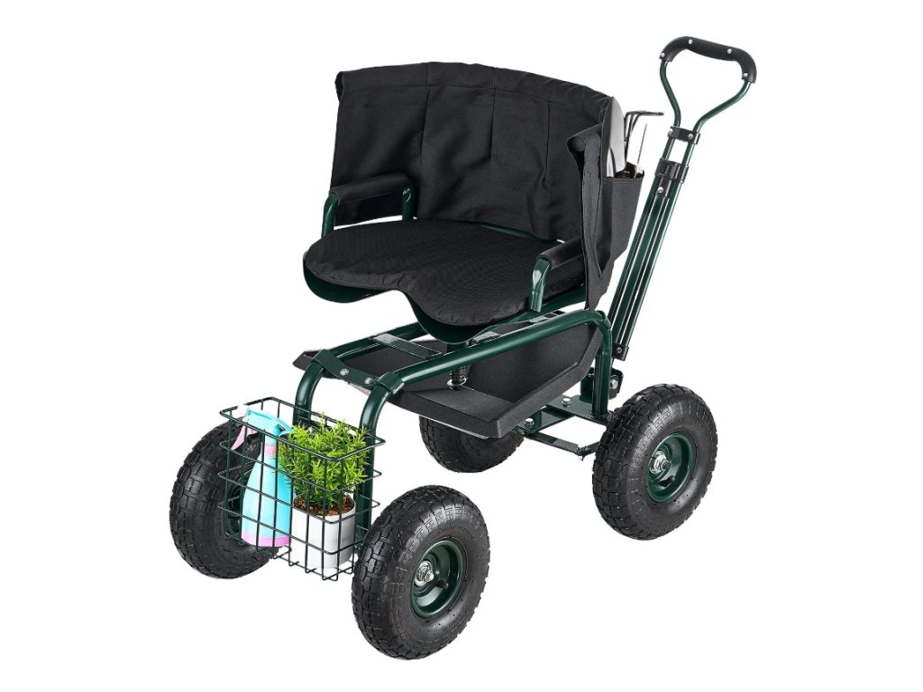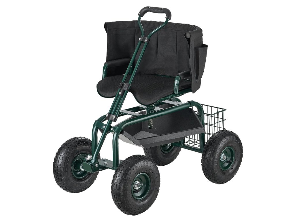 Pojízdný zahradní sedák s 25,4 cm nafukovacími terénními pneumatikami, nastavitelnou rukojetí (58–83,5 cm) a 360° otočným polstrovaným sedadlem pro pohodlnou práci. Odolná konstrukce s nosností až 180 kg doplněná o odnímatelný box na nářadí a drátěný koš udrží vše potřebné po ruce. Vhodný pro zahradu, dílnu i venkovní pracovní plochy.