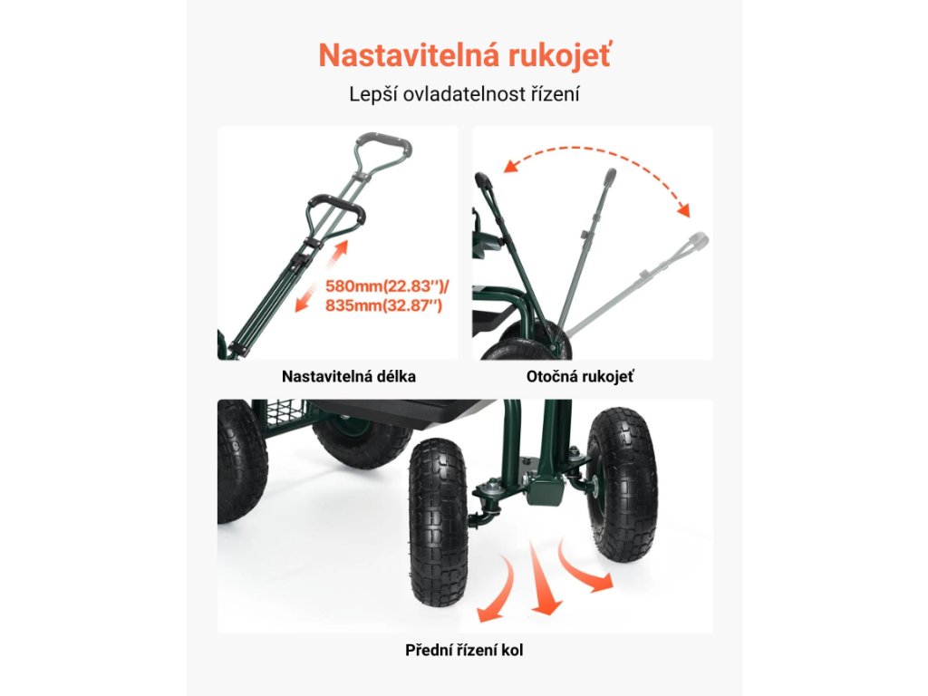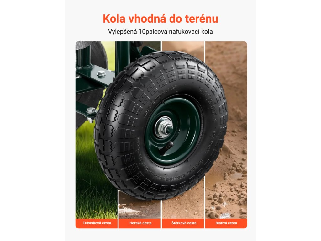 Zahradní vozík je vybaven 25,4 cm nafukovacími pneumatikami, které účinně tlumí nárazy a zajišťují plynulý pohyb i na nerovném terénu. Nastavitelná rukojeť v rozsahu 58–83,5 cm umožňuje snadné tažení a šetří námahu při práci.
