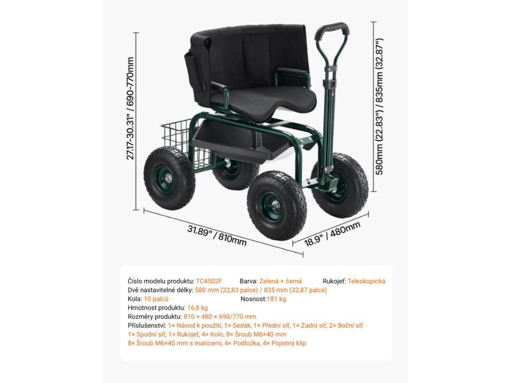 Mobilní zahradní vozík s otočným sedákem a teleskopickou rukojetí 810×480×690