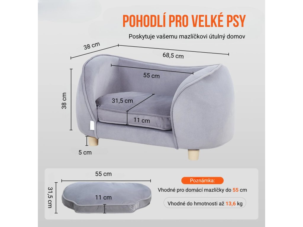 Psí pohovka o rozměrech 68,5 × 38 × 38 cm je určena pro odpočinek domácích mazlíčků různých velikostí. Nabízí 11 cm silnou pěnovou výplň, měkký sametový povrch odolný proti poškrábání, čtyři podpůrné nohy vysoké 5 cm a praktický tvar poskytující pocit bezpečí, ideální pro použití doma i v ordinaci či zverimexu.