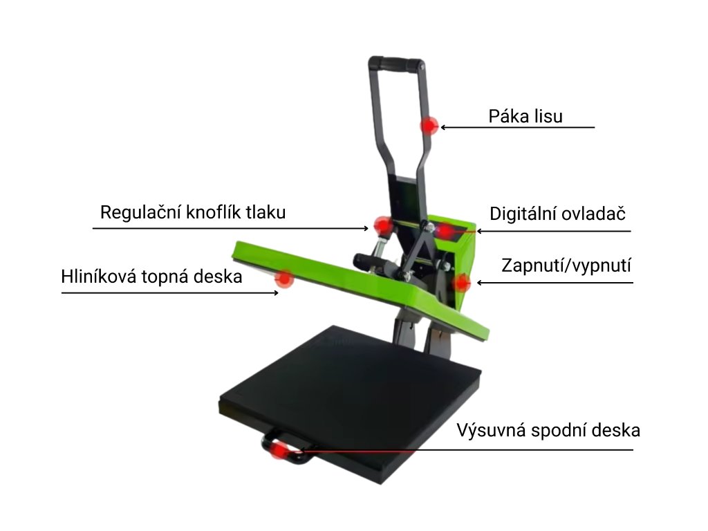 Hlavní předností modelu je jeho zásuvkový mechanismus. Pomocí pomocného madla můžete celou spodní pracovní desku úplně vysunout mimo horkou zónu. To vám dává dostatek prostoru pro dokonalé vyhlazení textilu a přesné pozicování transferů bez obav z kontaktu s horní deskou o teplotě až 250 °C. Tato funkce nejen chrání vaše ruce, ale také výrazně zrychluje a zpřesňuje celou produkci.