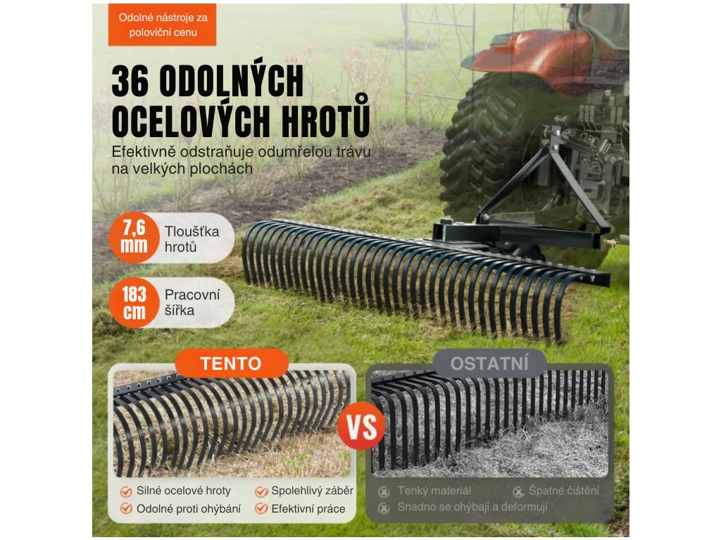 Provzdušňovač trávníku za traktor, 36 zubů, pracovní záběr 183 cm