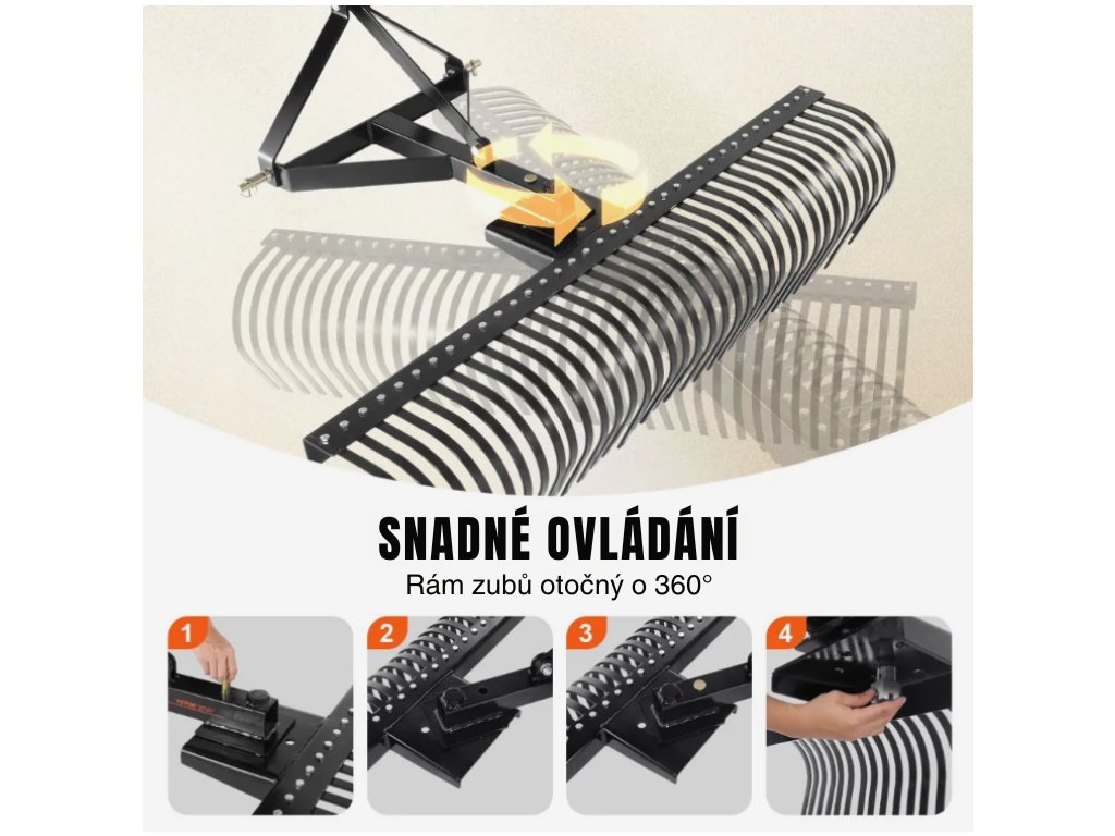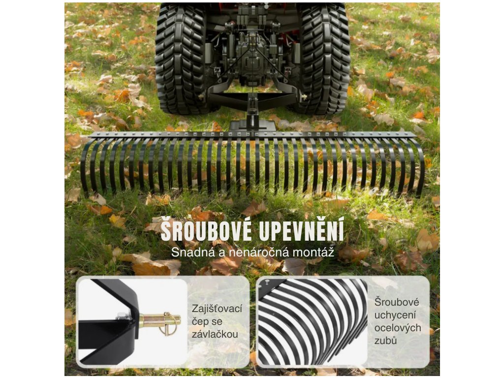 Provzdušňovač trávníku za traktor s pracovní šířkou 183 cm a 36 zahnutými zuby je určen pro efektivní úpravu a regeneraci trávníkových ploch. Díky tažení za traktorem a možnosti výměny nástavců zvládne několik různých operací s jedním zařízením.