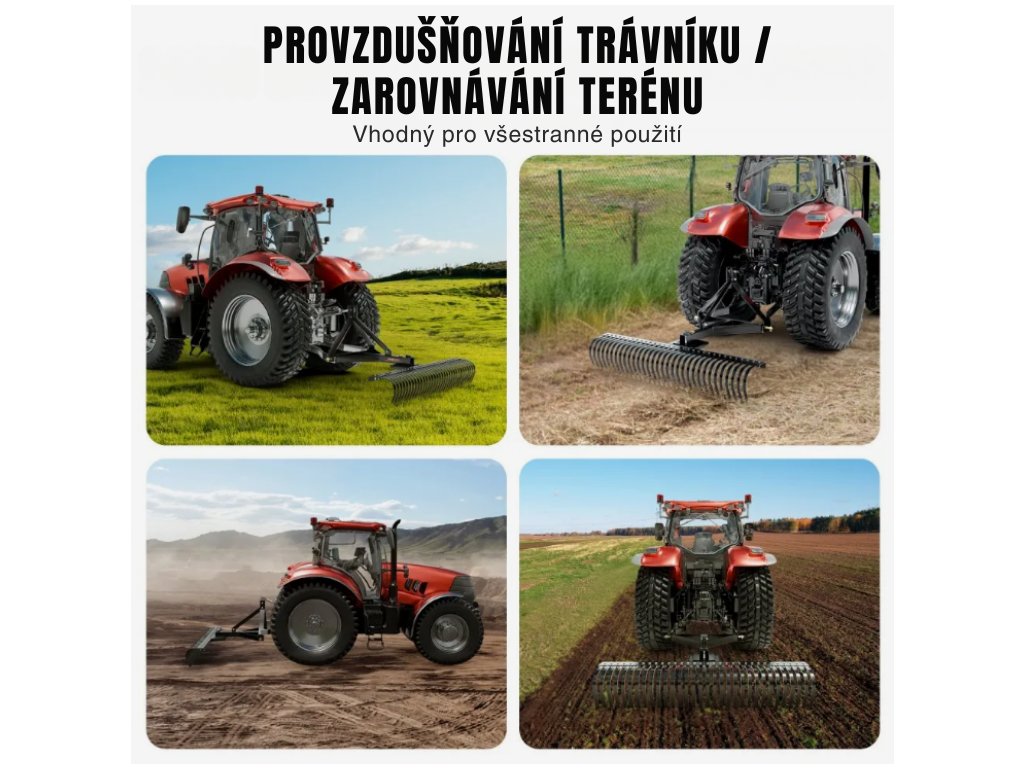 Provzdušňovač trávníku za traktor s pracovním záběrem 183 cm a 36 ocelovými hroty je vybaven tříbodovým závěsem a třemi vyměnitelnými nástavci pro univerzální použití na trávnících, polích a zahradách. Robustní ocelová konstrukce zajišťuje dlouhou životnost i v náročných podmínkách.