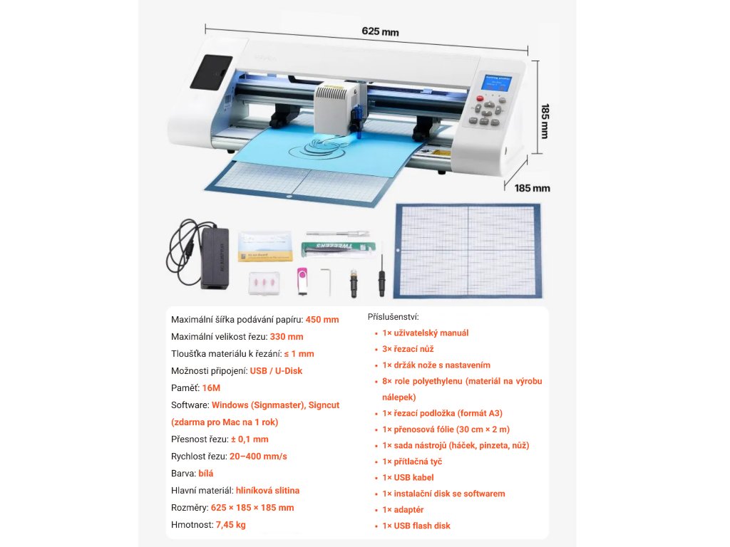Řezací plotr s pracovní šířkou 330 mm a funkcí automatického rozpoznání okrajů nabízí přesné řezy s tolerancí ±0,1 mm při rychlosti až 400 mm/s. Podporuje více než 100 druhů materiálů (včetně samolepicích fólií, HTV, papíru či EVA pěny) a umožňuje 10 úrovní nastavení tlaku čepele. Díky integrovanému softwaru s knihovnou návrhů a podpoře formátů SVG, EPS, PLT a AI je vhodný pro hobby i profesionální využití.