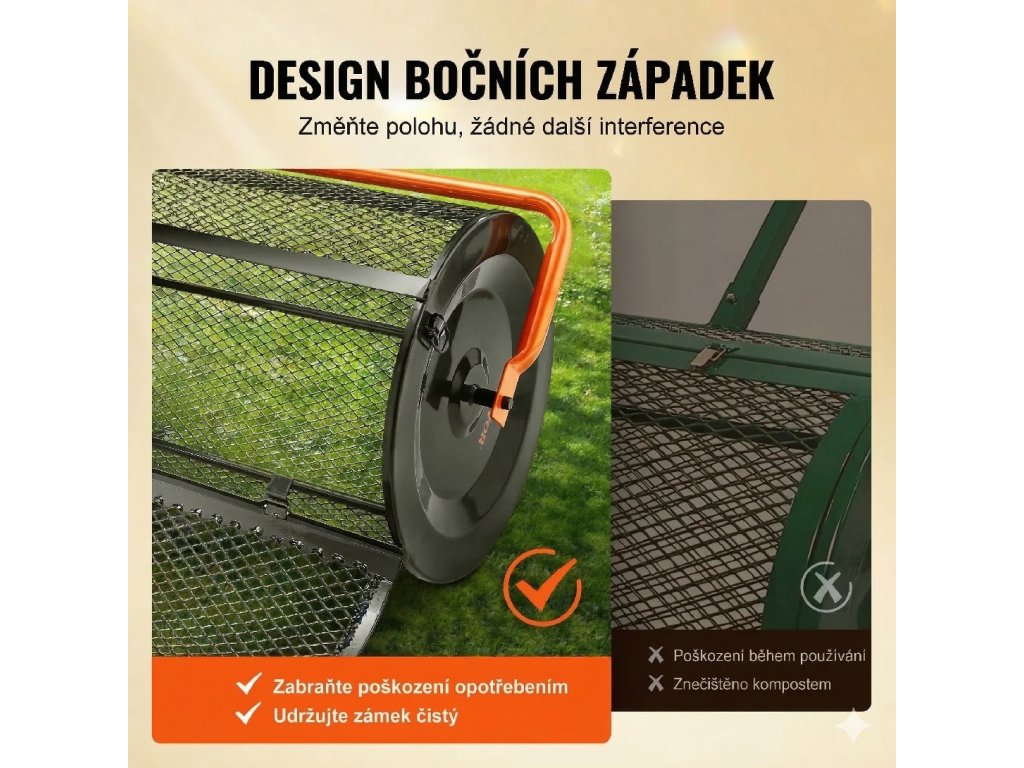 Rozmetač je vybaven dvěma zesílenými bočními zámky, které udržují koš bezpečně uzavřený během práce. Tento systém minimalizuje riziko nechtěného otevření při naklánění nebo při pohybu po nerovném terénu.