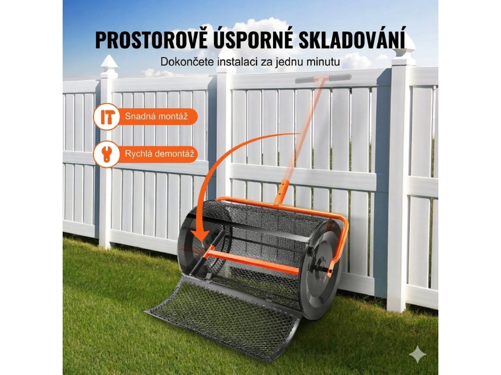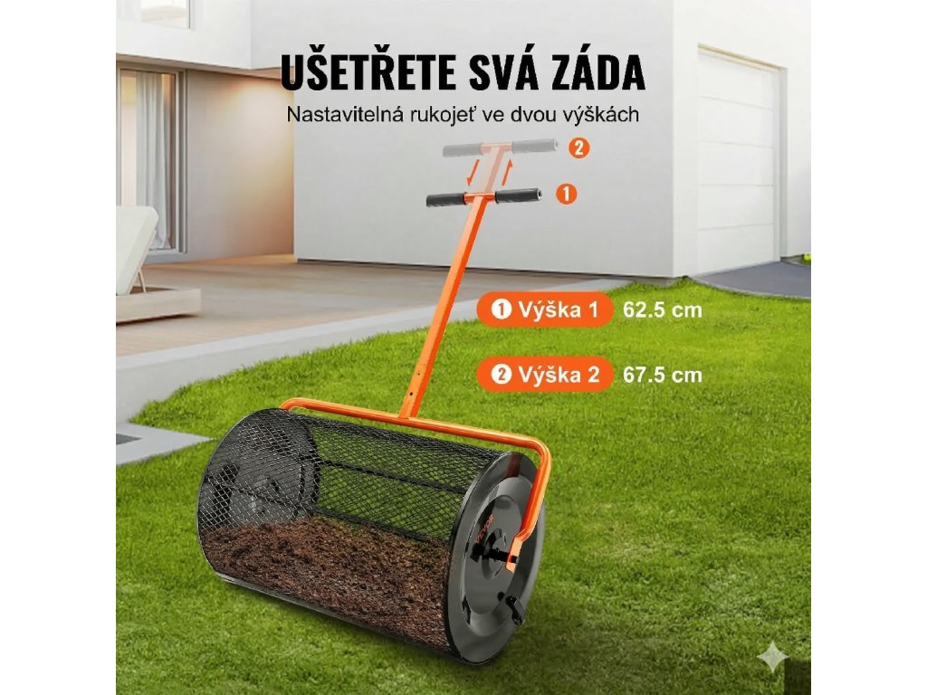 Hlavní pracovní část tvoří ocelový válcový koš o šířce 61 cm, který umožňuje rychlé pokrytí větší plochy během krátké doby. Oproti ručnímu rozmetání výrazně šetří čas i fyzickou námahu a zároveň pomáhá udržet rovnoměrnou vrstvu materiálu na celé ploše.