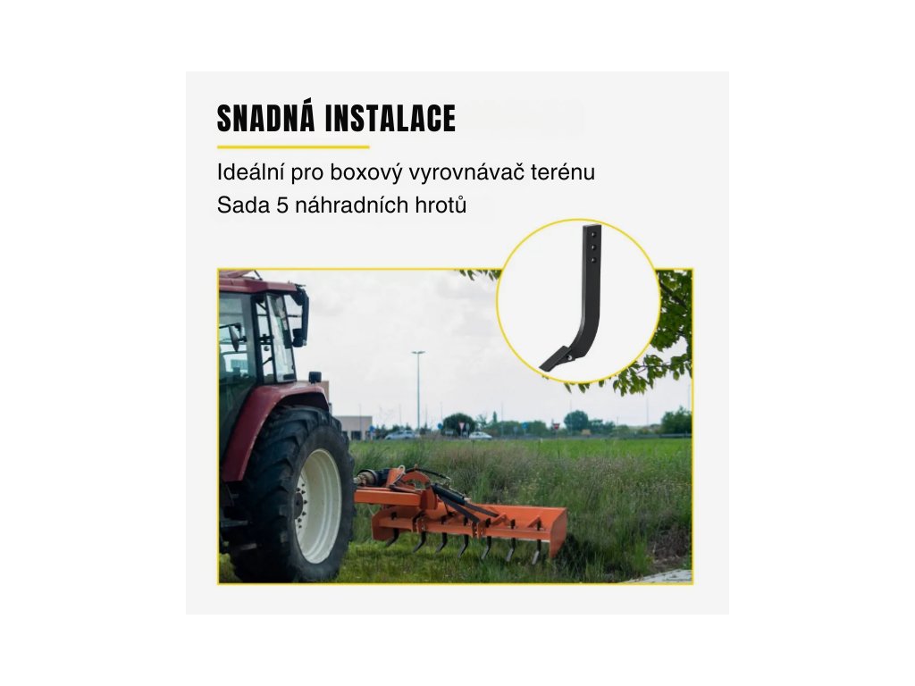 Tato sada pěti rozrývacích trnů určených pro použití s traktorovými radlicemi je vhodná pro náročné terénní práce, včetně srovnávání půdy nebo přípravy ploch před výsadbou. Jejich robustní konstrukce a možnost výměny zubů zajišťují dlouhou životnost a flexibilní použití v různých podmínkách.