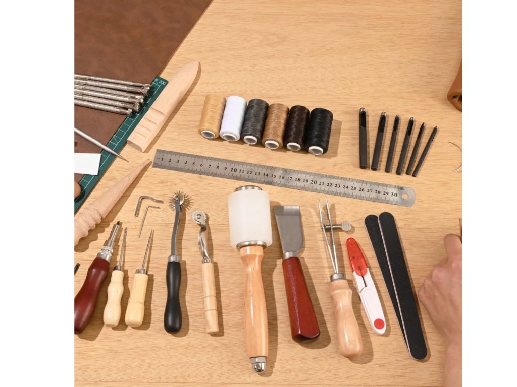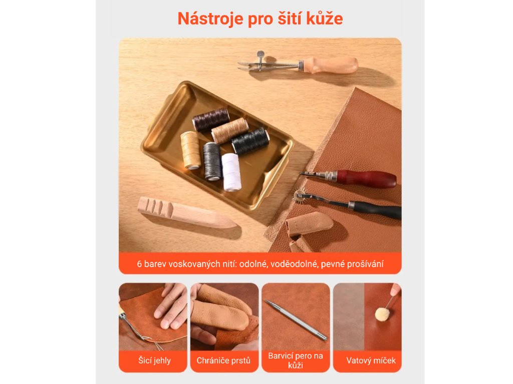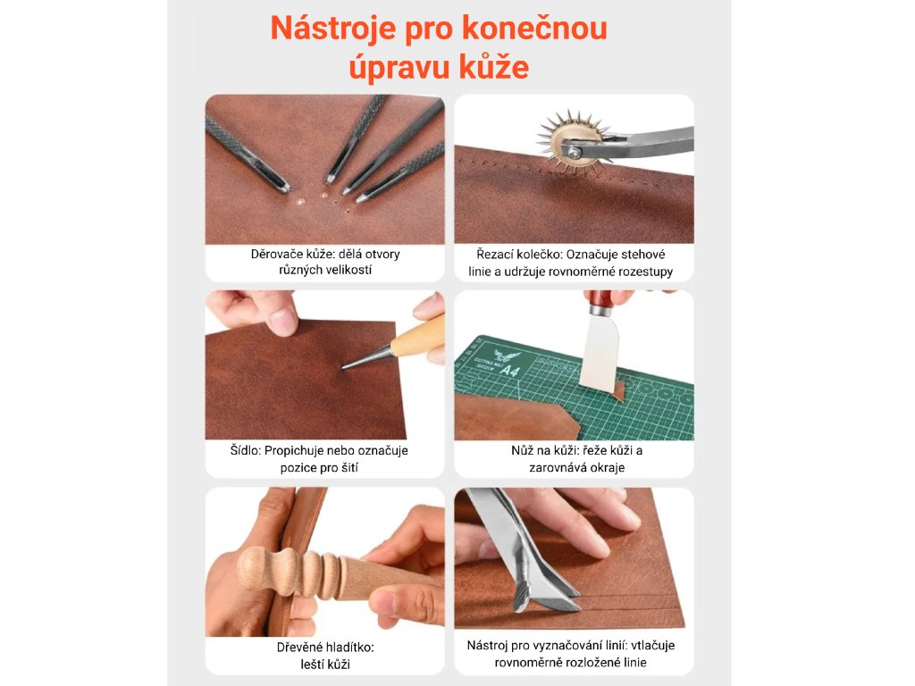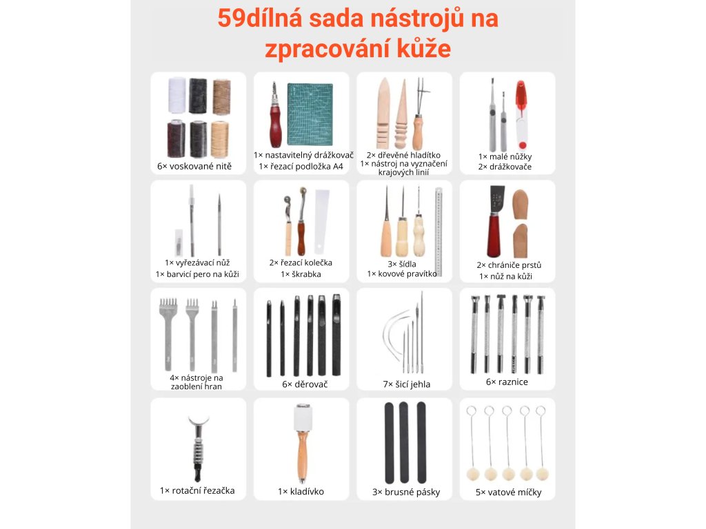 Sada obsahuje 59 nástrojů pro základní i pokročilé úkony při zpracování kůže. Díky pestré výbavě – od řezáků a děrovačů až po šicí nástroje a razítkovací pomůcky – poskytuje spolehlivý základ pro výrobu a úpravu kožených produktů v domácí dílně nebo při řemeslné výuce.