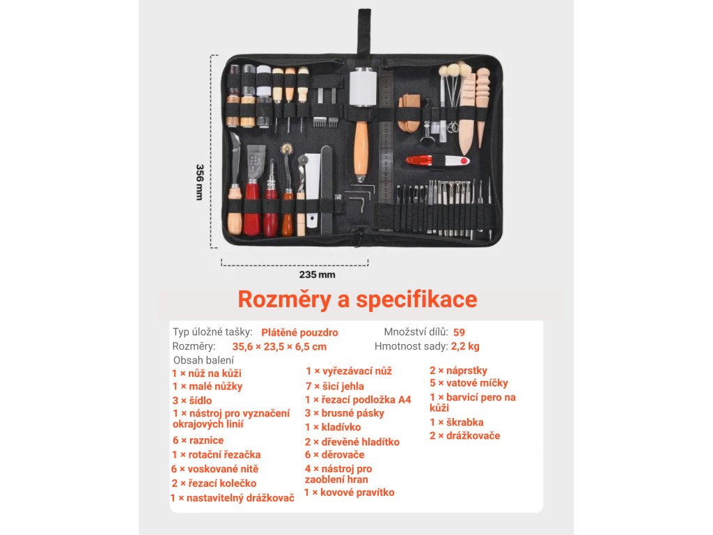 Tato 59dílná sada nástrojů na zpracování kůže je určena pro řezání, děrování, šití i zdobení kůže a dalších materiálů. Obsahuje odolné nástroje s dřevěnými rukojeťmi uložené v plátěné tašce o rozměrech 390 × 270 × 70 mm, s celkovou hmotností cca 3 kg. Vhodná pro začátečníky i pokročilé řemeslníky.