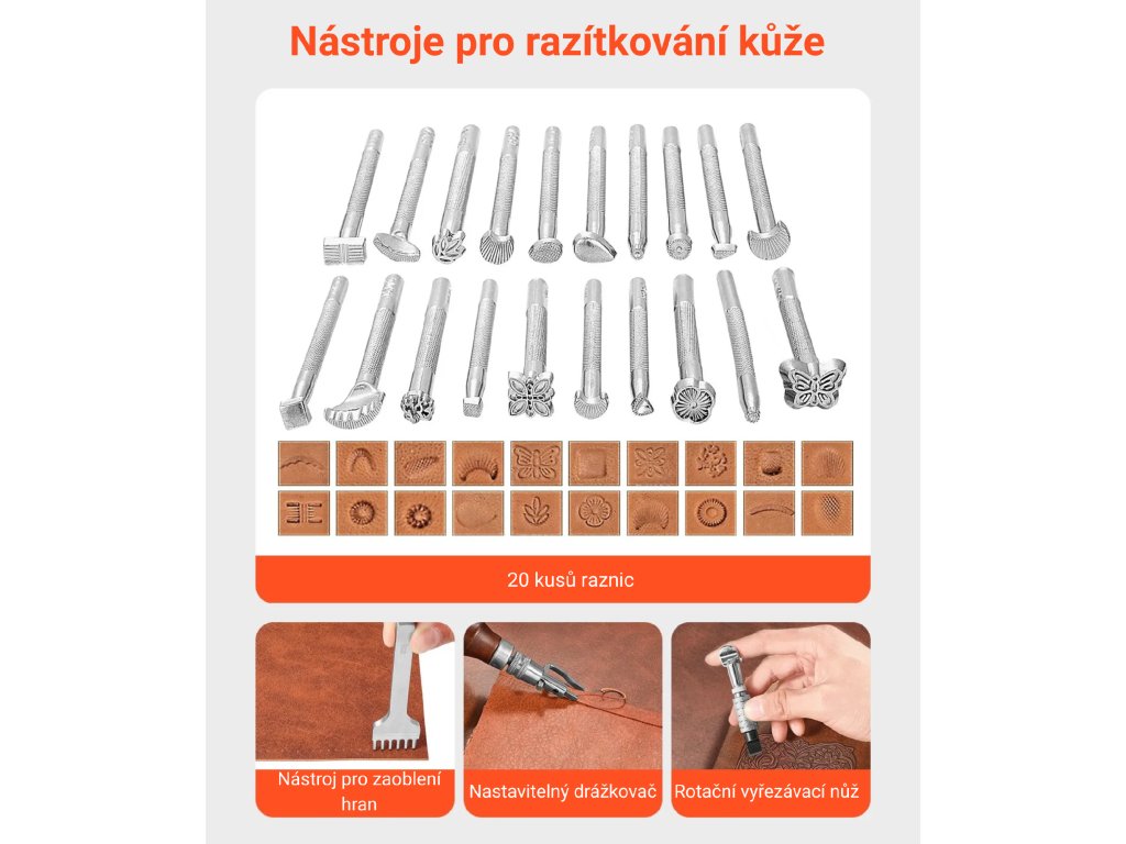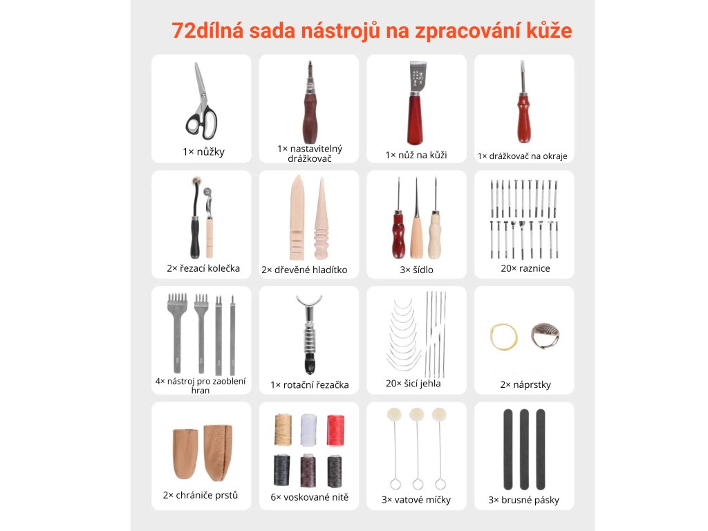 Sada nástrojů pro zpracování kůže – 72dílná sada pro ražbu, razítkování a šití