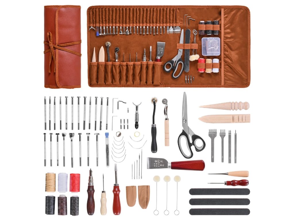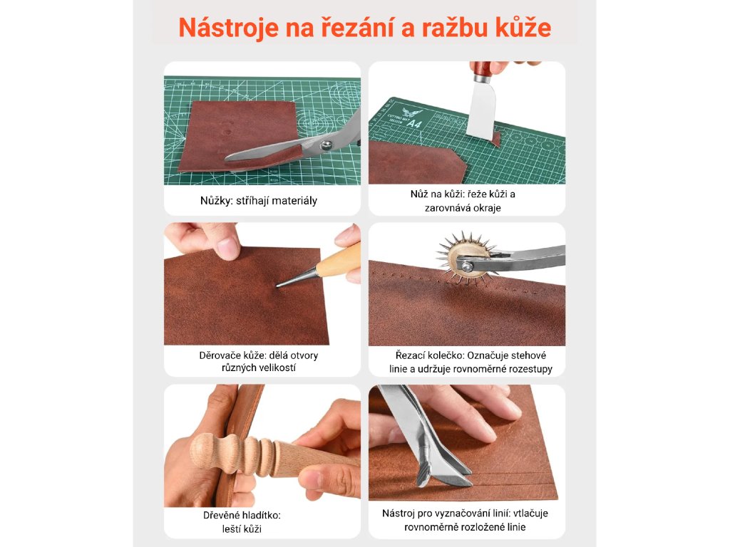 Tato 72dílná sada pro práci s kůží obsahuje kompletní výběr nástrojů pro řezání, tvarování, značení, ražbu a šití. Je vhodná jak pro začátečníky, tak pro pokročilé řemeslníky, kteří chtějí ručně vyrábět nebo opravovat kožené výrobky, a zároveň poskytuje široké možnosti využití i při práci s dalšími materiály, jako je džínovina, silnější látky nebo plátno.