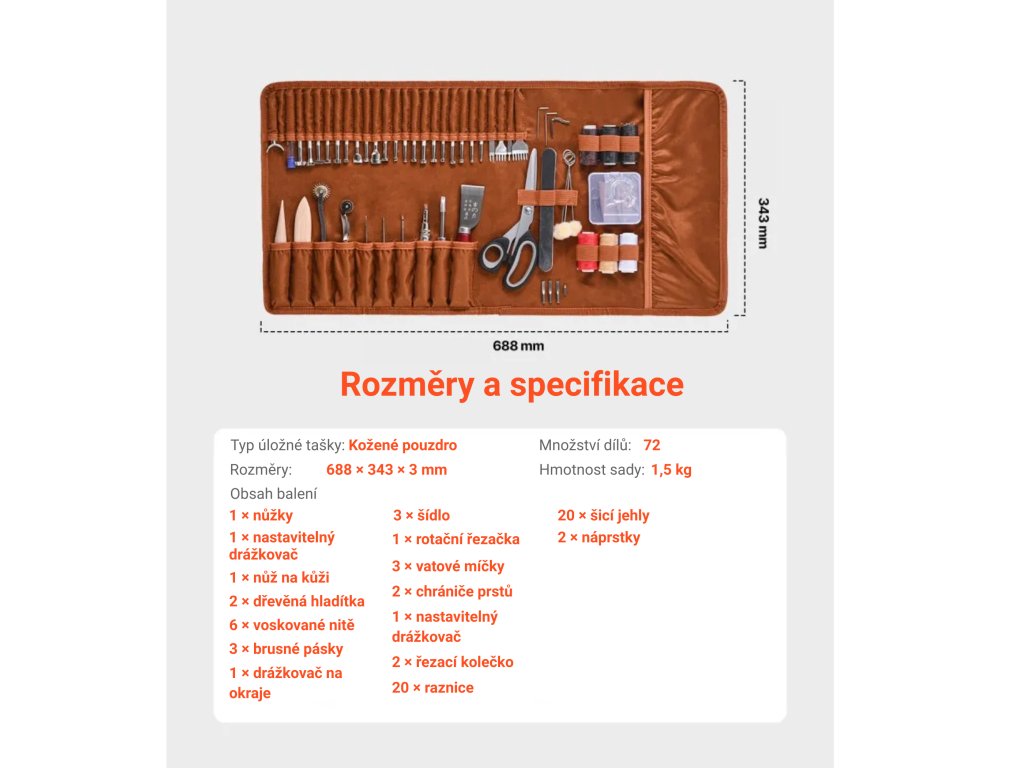 Sada nástrojů pro zpracování kůže obsahuje 72 dílů určených pro řezání, ražbu, značení, tvarování a šití kůže i dalších materiálů. Nástroje jsou vyrobeny z odolného kovu s dřevěnými rukojeťmi a přehledně uspořádány v rolovací tašce z umělé kůže. Vhodné pro začátečníky i pokročilé řemeslníky.