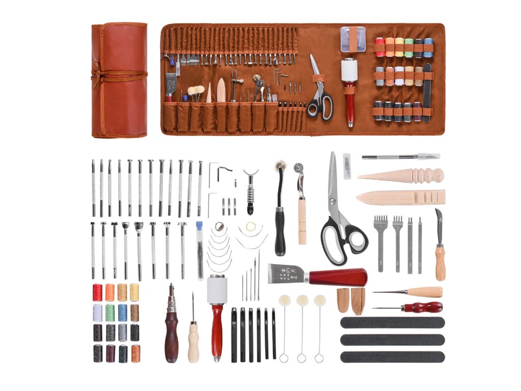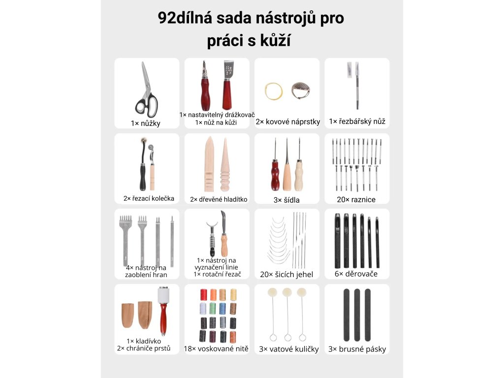 92dílná sada nástrojů pro zpracování kůže vhodná pro řezání, šití, děrování i ražbu. Obsahuje kvalitní kovové nástroje s dřevěnými rukojeťmi, přehledně uložené v praktickém pouzdře. Ideální pro začátečníky i pokročilé – skvělá volba i jako dárek.
