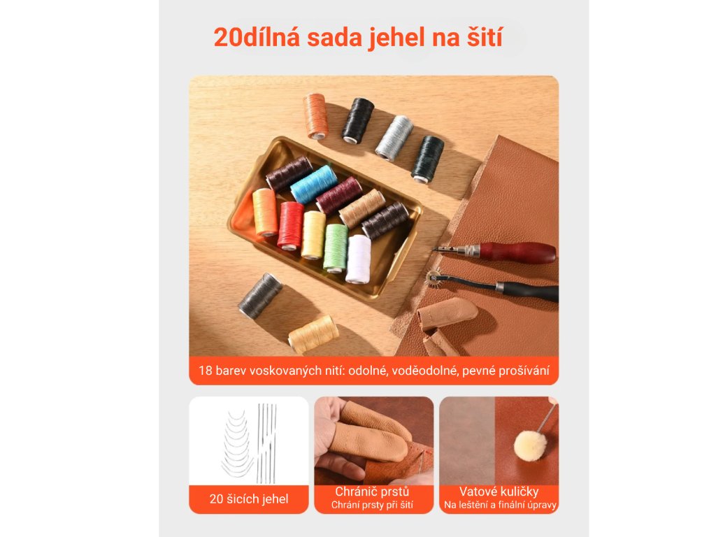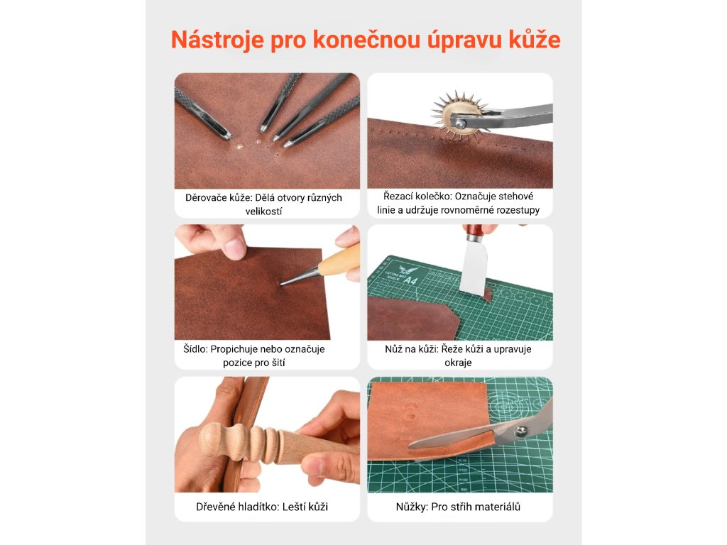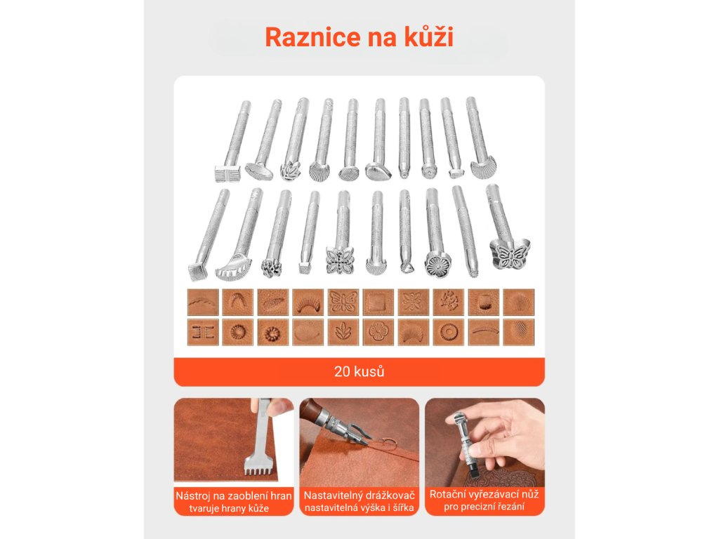 Sada obsahuje široký výběr nástrojů pro všechny základní techniky – řezání, děrování, tvarování, razítkování i ruční šití. Využijete ji například při výrobě peněženek, opasků, pouzder, brašen, obuvi, šperků nebo při opravách a dekorování kožených doplňků. Vhodná je i pro práci s jinými materiály jako džínovina, plátno nebo silnější látky. Všechny nástroje jsou přehledně uspořádány a připraveny k okamžitému použití.